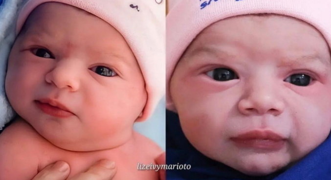 A comparação foi feita pelo marido de Thaeme na web com uma montagem. A primeira foto sendo Ivy em 2021 e a segunda uma imagem de Liz em 2019, quando nasceu: "Minhas gatinhas", legendou o empresário.
